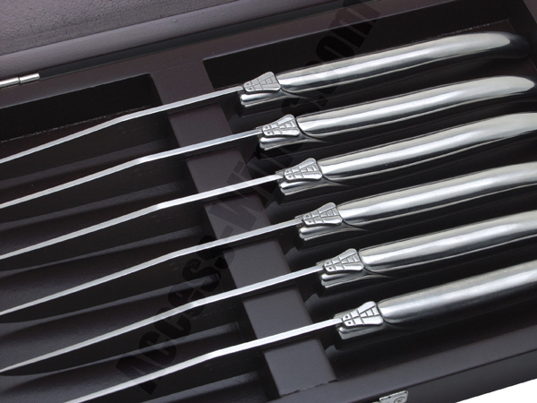 Set de 6 Laguioles de table en acier inoxydable 420 à usage alimentaire (acier martensitique conforme à la norme EN10088-2 2005). Manche forgée (plein). Compatible lave vaisselle. Livrés dans un coffret en bois.